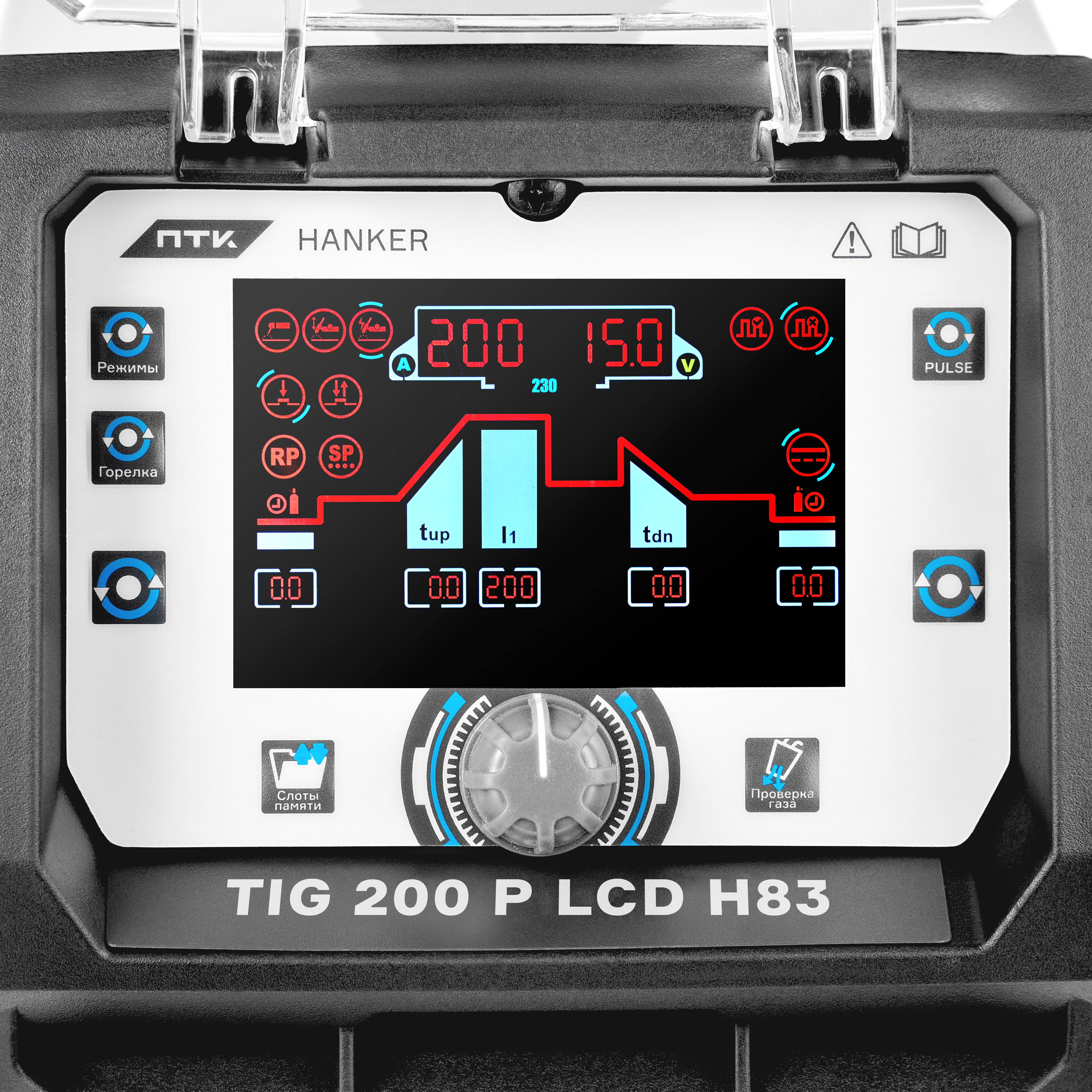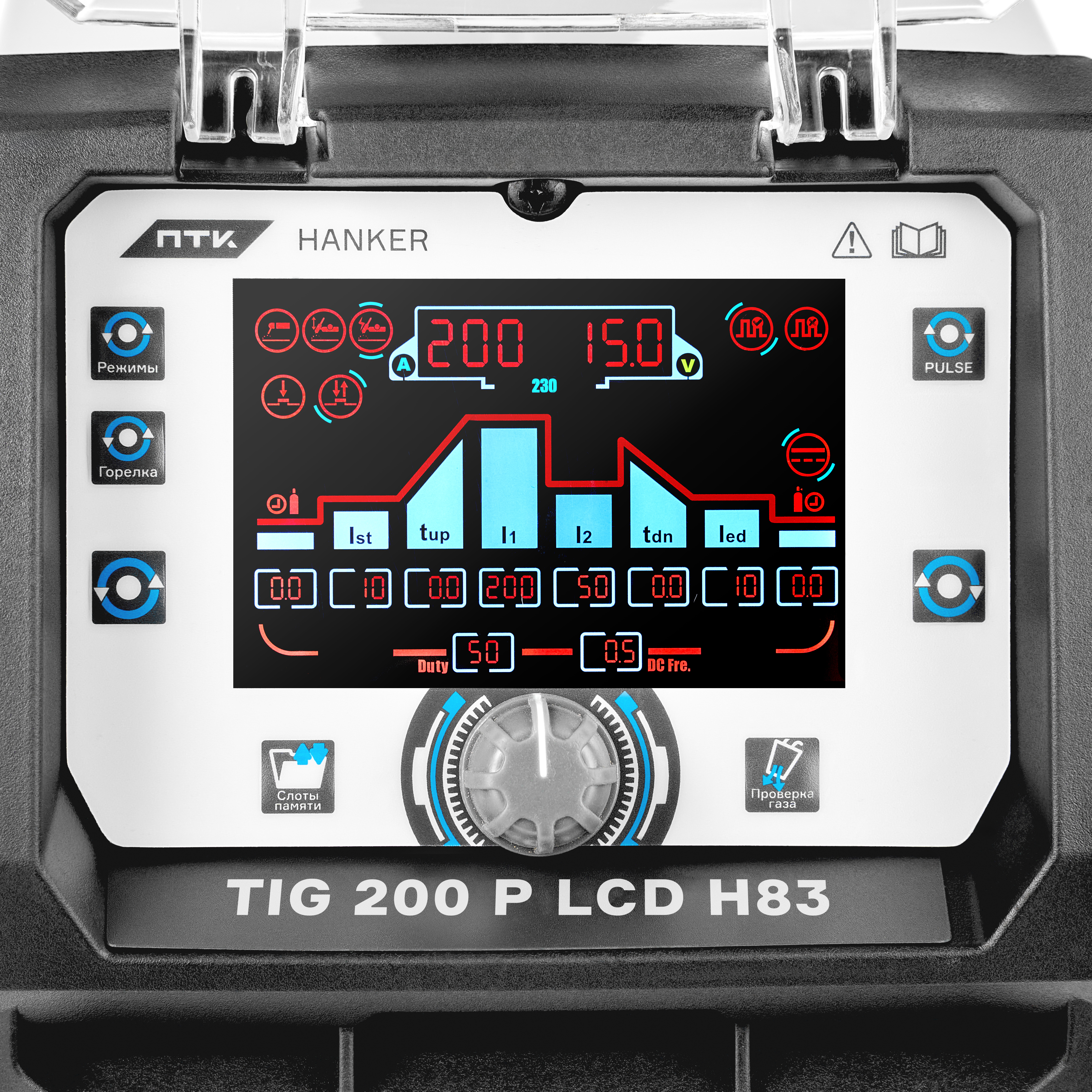 Аппарат аргонодуговой сварки ПТК HANKER TIG 200 P H83 предназначен для сварки на постоянном токе (DC) с возможностью работы в импульсном режиме (PULSE). Оборудование обеспечивает стабильную дугу и высокое качество сварного шва при работе с различными металлами.Импульсный режим позволяет эффективно выполнять сварку изделий небольшой толщины, снижая тепловую нагрузку на металл и предотвращая его прожигание и деформацию.Аппарат подходит для сварки различных материалов: нержавеющей и углеродистой стали, легированных сплавов, меди и других металлов. Простое и удобное управление позволяет быстро настраивать параметры сварки и добиваться стабильных результатов. Аппарат оснащен цифровым LCD дисплеем, который делает настройку параметров сварки удобной и наглядной. Пользователь может точно регулировать параметры сварочного процесса, включая частоту импульсов, время нарастания и спада тока, а также задержку подачи газа после сварки. В комплект поставки к аппарату входит сварочная горелка TIG 26 серии с воздушным охлаждением. Горелка может работать в режиме 2T/4T, в режиме повтора, сваривать точками и регулировать силу сварочного тока при помощи кнопок на рукоятке. ПТК HANKER TIG 200 P H83 поддерживает несколько режимов сварки, что делает аппарат универсальным инструментом для профессиональной работы.Поддерживаемые режимы сварки:DC TIGDC Pulse TIGDC MMATIG HFLift TIGРежим TIG HFКлассический режим бесконтактного поджига дуги. Все параметры вносятся сварщиком самостоятельно. Подбор сварочного тока можно делать указав толщину свариваемого изделия. Аппарат автоматически рассчитает ток, отталкиваясь от заданной толщины.Режим LIFT TIGРежим, при котором дуга на вольфрамовом электроде возбуждается касанием об металл. Такие требования часто применимы на производствах, где не допустимо разжигать дугу высокочастотным поджигом (TIG HF), например на объектах атомной энергетики. В режиме LIGT TIG возможен только выбор режима горелки 2T/4Т. Настройки в режиме LIFT TIG совпадают в настройками в режиме TIG HF (бесконтактный поджиг).Расширенные настройки TIG сваркиРегулировка частоты импульсов (Pulse Frequency). Позволяет настраивать частоту переключения между пиковым и базовым сварочным током в импульсном режиме.Регулировка длительности импульса (Pulse Width). Позволяет изменять соотношение между пиковым и базовым током, регулируя тепловложение при сварке.Особенности ПТК HANKER TIG 200 P H83:LCD дисплей для удобного контроля и настройки сварочных параметров.Сварка на постоянном токе (DC) с возможностью работы в импульсном режиме.Высокочастотный поджиг дуги (TIG HF) и поджиг касанием Lift TIG для удобного начала сварки.Возможность регулировки параметров сварки: времени нарастания и спада тока, частоты импульсов и задержки подачи газа.Дополнительный режим ручной дуговой сварки MMA с использованием электродов диаметром от 1,5 до 5,0 мм. В режиме MMA доступны функции Hot Start, Arc Force и Anti Stick, обеспечивающие стабильное зажигание дуги и предотвращающие залипание электрода.Возможность работы горелки в режимах 2T / 4T, а также режим повторения импульсов и точечной сварки.Функция сохранения параметров сварки с возможностью записи индивидуальных настроек. Аппарат имеет 10 слотов памяти.Возможность подключения пульта или педали дистанционного управления для удобства работы (приобретается отдельно).Интеллектуальная система защиты от п