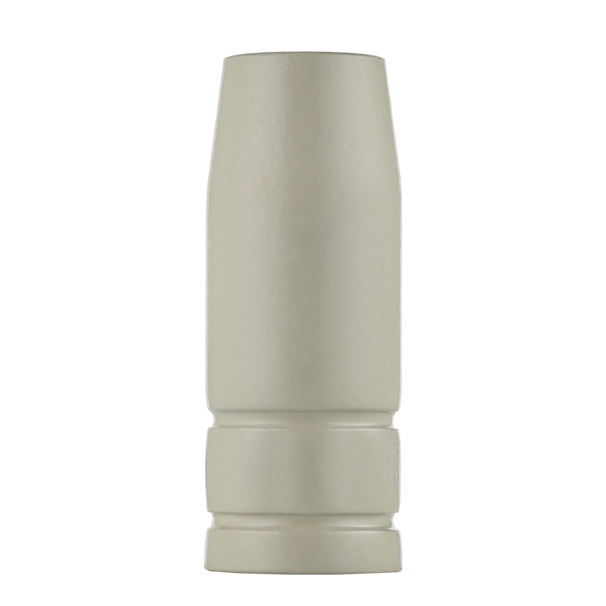 Газораспределительное сопло с керамическим покрытием для полуавтоматических горелок MIG MP 25 всех серий. Выходной внутренний диаметр сопла 15 мм. Сопло используется для равномерного распределения газового потока и для защиты сварочного наконечника от механического воздействия или случайного соприкосновения со свариваемым изделием.Сопло изготовлено из меди, сверху нанесён керамический слой, который работает как электрический и термический изолятор поверхности.Керамическое покрытие наносится специальным технологическим процессом, образуется гомогенный ровный слой, рассчитанный на промышленную эксплуатацию такого газораспределительного сопла. Керамический слой состоит из броннитрида (бор нитрид, BN).Отличительная особенность сопла CRM2515 – это керамическое покрытие:Керамическое покрытие создаёт термобарьер, так как керамика выдерживает очень высокие температуры, не расплавляется и не деформируется.Покрытие препятствует прилипанию сварочных брызг за счёт очень гладкой поверхности. Брызги либо отскакивают, либо слабо держатся и легко счищаются.Из-за отсутствия налипших брызг металла формируется более стабильный газовый поток и дуга. Увеличивается продолжительность работ без остановки и последующей очистки сопла и комплектующих для горелки MIG.Керамический слой заметно увеличивает ресурс сопла и расходных частей сварочной горелки.Область применения сопел с керамическим покрытием:Узкощелевое сваривание труб, толстых стенок. Орбитальная сварка, где сопло или наконечник может задеть стенку свариваемого изделия. В таком случае керамическое покрытие выступает в роли диэлектрика, защищает от коротких замыканий, снижает риск «поджигания» дуги по боковой стенке и медных включений в металл шва.Сварка порошковой проволокой, где нужно увеличить токи и скорость без потери качества корня.Автоматизированные линии и роботизация, где критичны длительные остановки рабочего процесса и присутствует минимальное обслуживание сварочных горелок.